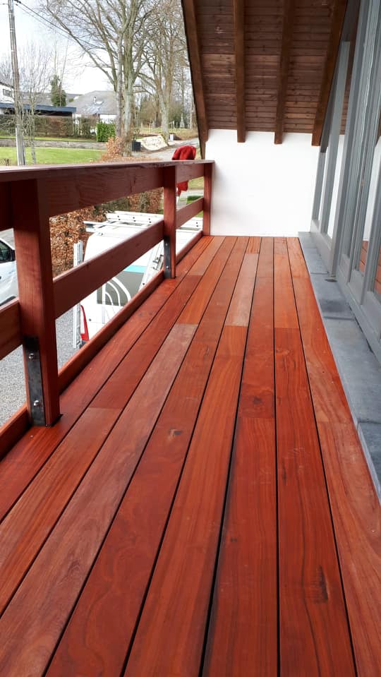 Terrasse de balcon et garde-corps en Padouk Menuiserie intérieure et extérieure Vous aimeriez savoir comment démarrer votre nouveau projet? Nous contacter